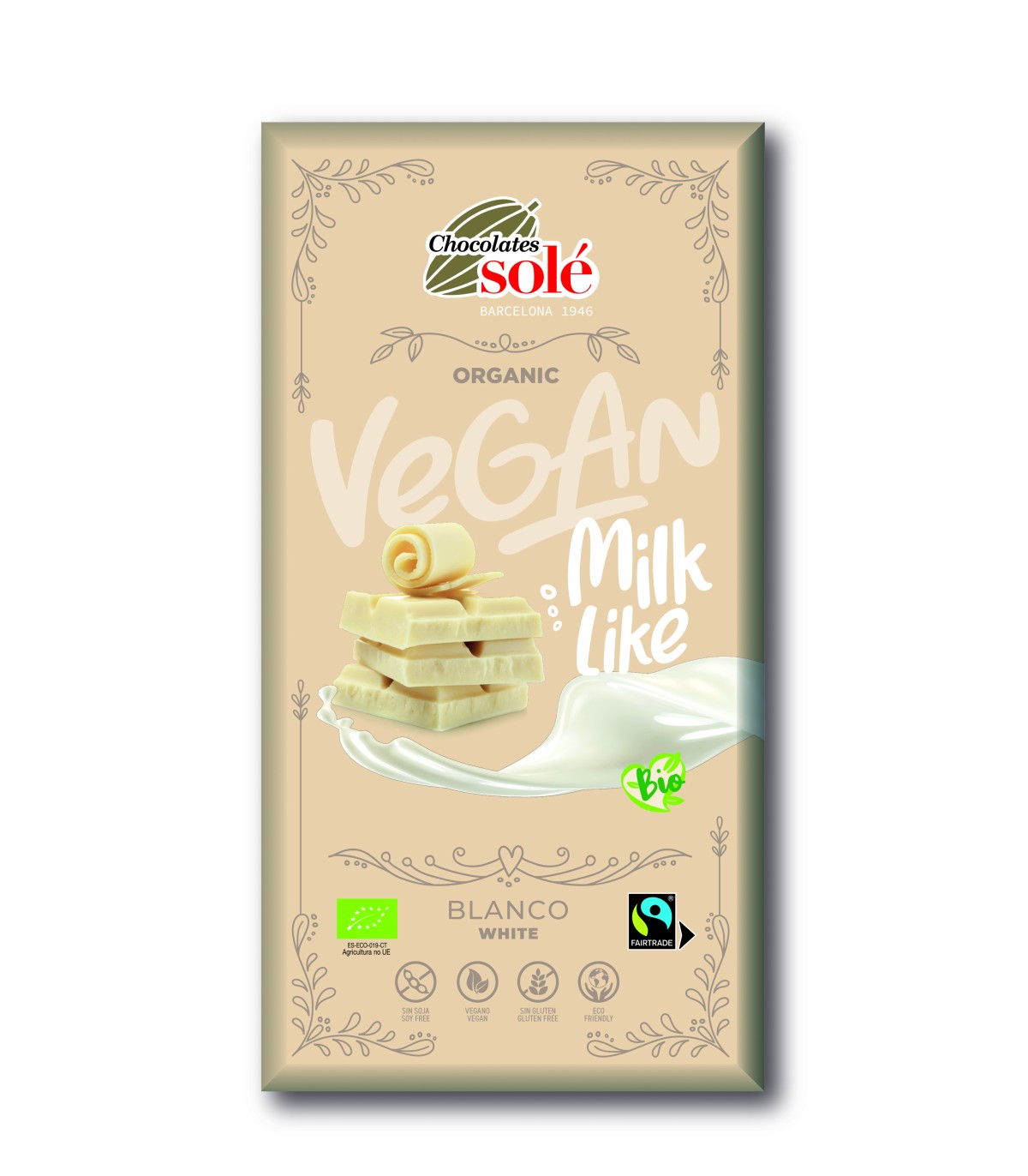 Tableta estilo blanco. Vegano. Apto para celíacos. Ingredientes de producción ecológica certificada.