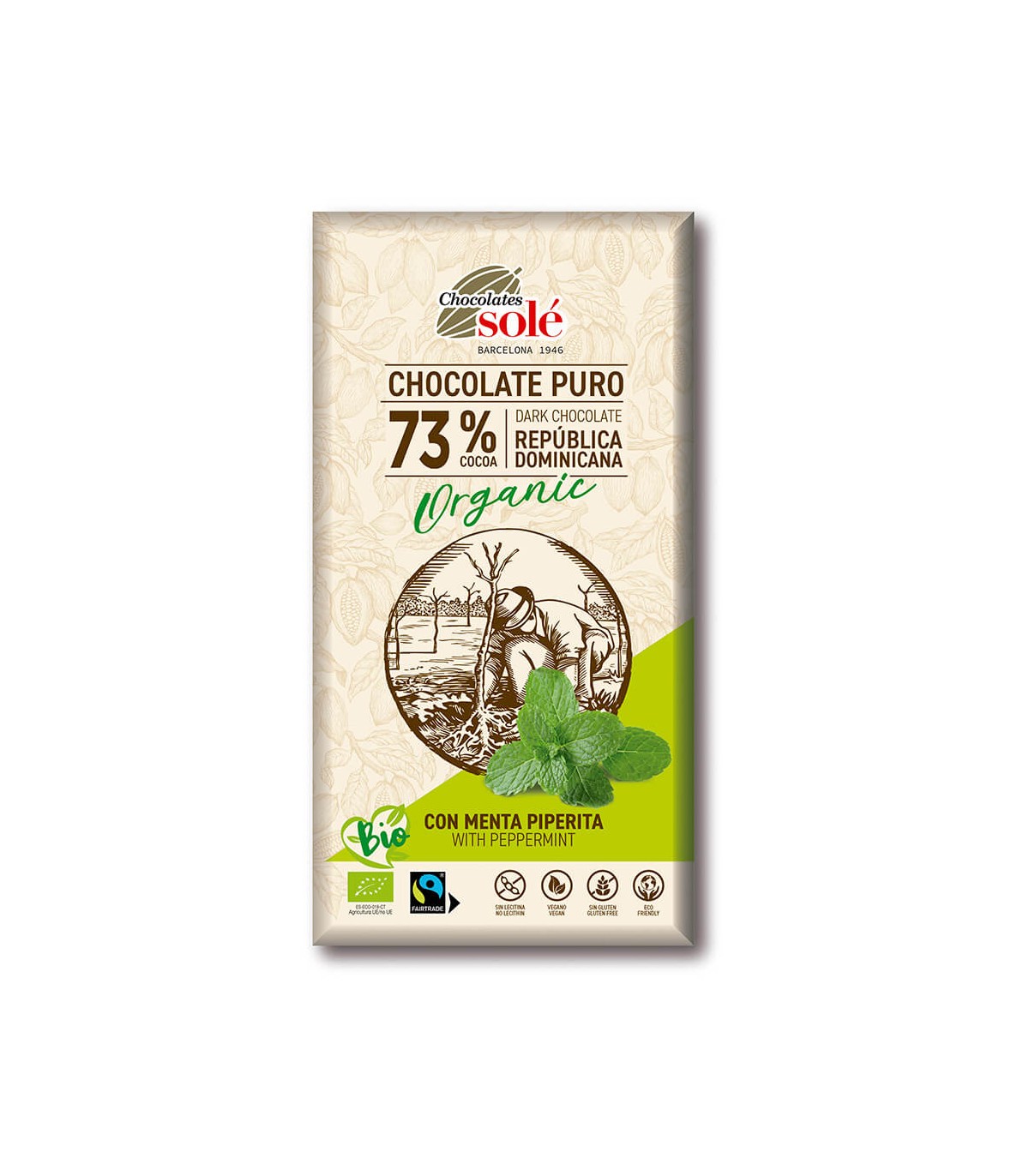 Chocolate puro 73% cacao de República Dominicana con menta piperita. Ingredientes de producción ecológica certificada. Apto para celíacos.