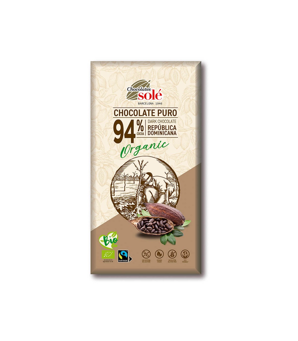 Chocolate puro 94% cacao de República Dominicana. Ingredientes de producción ecológica certificada. Apto para celíacos.