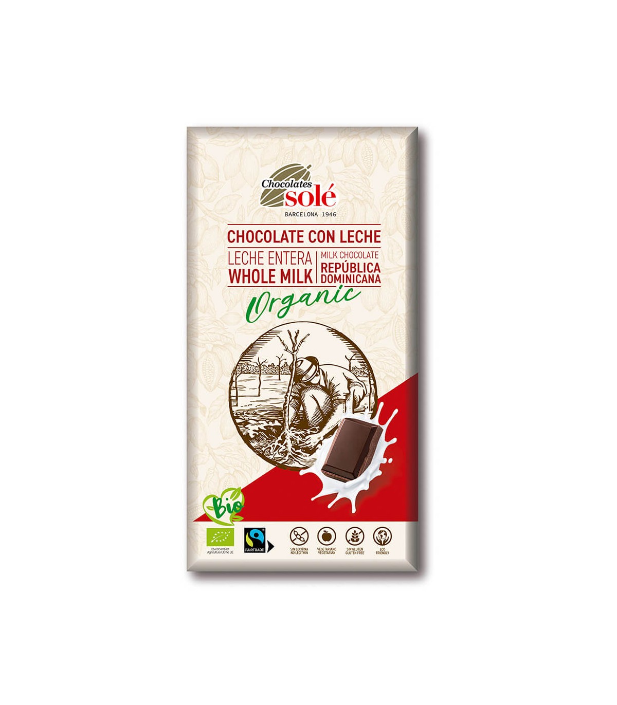 Chocolate con leche. 39% cacao de República Dominicana. Ingredientes de producción ecológica certificada. Apto para celíacos.