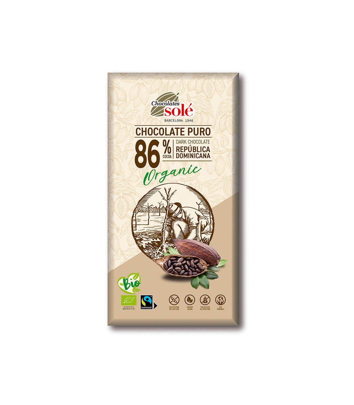 Chocolate puro 86% cacao de República Dominicana. Ingredientes de producción ecológica certificada. Apto para celíacos.