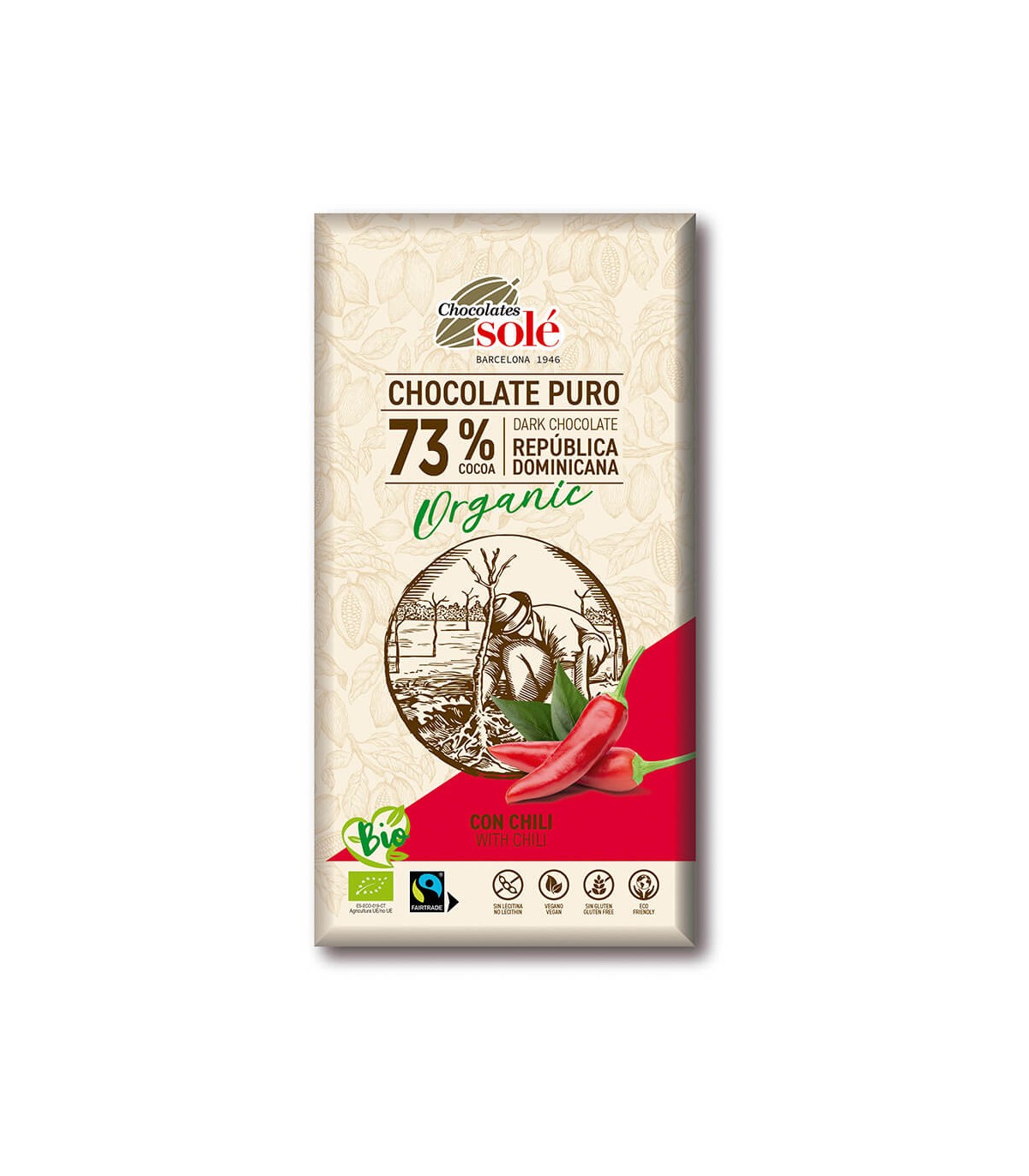 Chocolate puro 73% cacao de República Dominicana con chili. Ingredientes de producción ecológica certificada. Apto para celíacos.