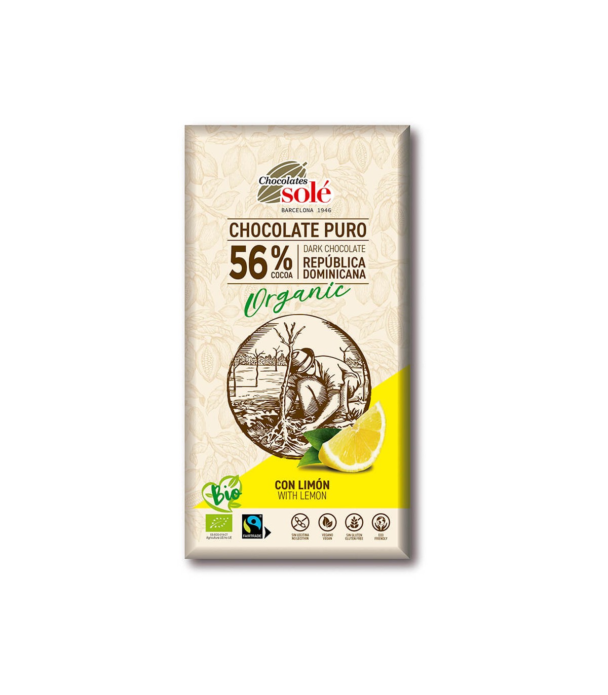 Chocolate puro 56% cacao de República Dominicana con limón. Ingredientes de producción ecológica certificada. Apto para celíacos.